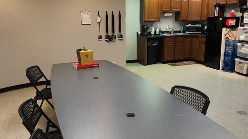 - Access to kitchen area which includes sink, small refrigerator, and large 15 seat conference table.
